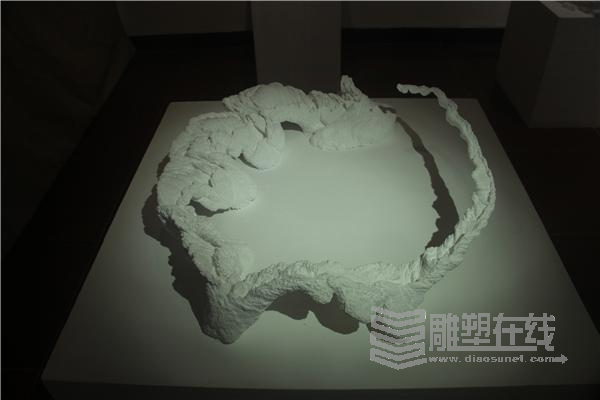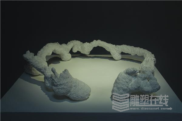 作品《遗骸》是以材料的属性去进行创作,探索材料自身的语言。作品以一种既远古又现代的形式存在着,是石膏在泡沫颗粒中流淌瞬间凝固的痕迹,留在作品上面的泡沫颗粒让作品显得更加生动起来。从选择材料到作品完成经历了许久,期间我再石膏泡沫水的比例间不断的进行调试,知道让我喜悦的“形”出现。当我把石膏倒进泡沫中,我想象出的泡沫颗粒中正发生的一切就像是在想象地底的蚁穴,它就像迷宫一样你不知道它究竟会形成什么样的空间。等待的石膏成型的时候,我内心非常的忐忑但又按耐不住的喜悦,那是一种正在等待生命降临的喜悦。一段时间后,石膏凝固了,我用双手去探索石膏在泡沫颗粒里所形成的“形”的边界,将它小心翼翼的取出来。至此,一次探险结束。这一次创作的经历,让我再次对时间和空间有了新的认识。